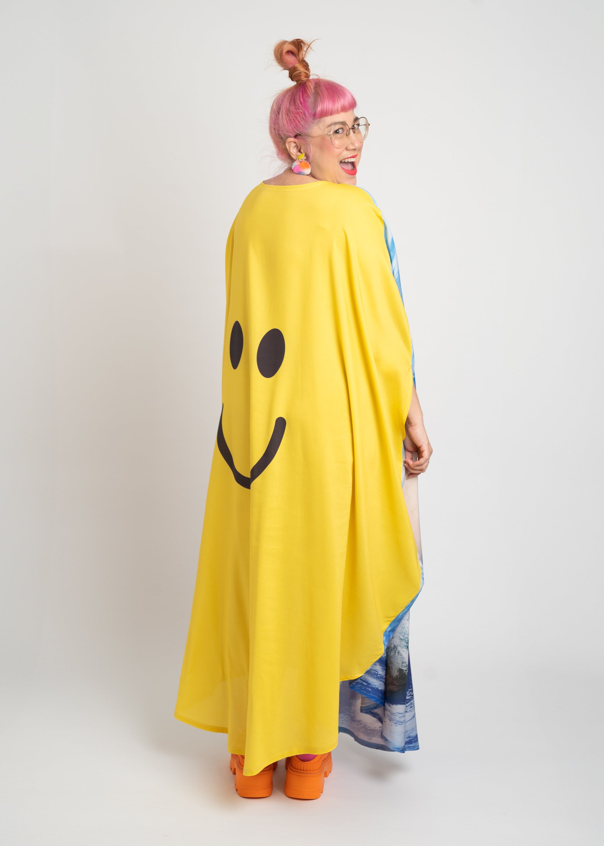 The Happy Planet Dress is a reversible caftan that lets you pick your vibe: rock the big, beautiful Earth on one side, or flip it to a sunny yellow smiley face for instant cheer. Twirl, sway, or just float through your day in a dress that literally wears happiness on the front. The world (and your wardrobe) deserves joy! Limited edition and made to order.